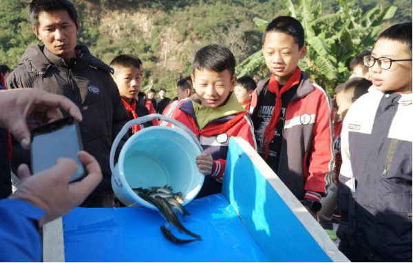 ▲ 松新镇小学生向黑水河放流珍稀特有鱼类
