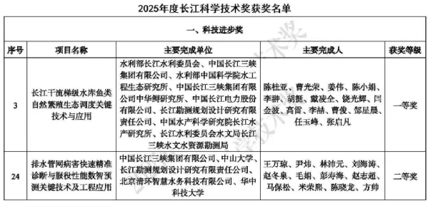 近日,2025年度长江科学技术奖揭晓,长江经济带生态环境国家工程研究中心依托集团公司申报的“长江干流梯级水库鱼类自然繁殖生态调度关键技术与应用”“排水管网病害快速精准诊断与服役性能数智化预测关键技术及工程应用”项目分别荣获一、二等奖。