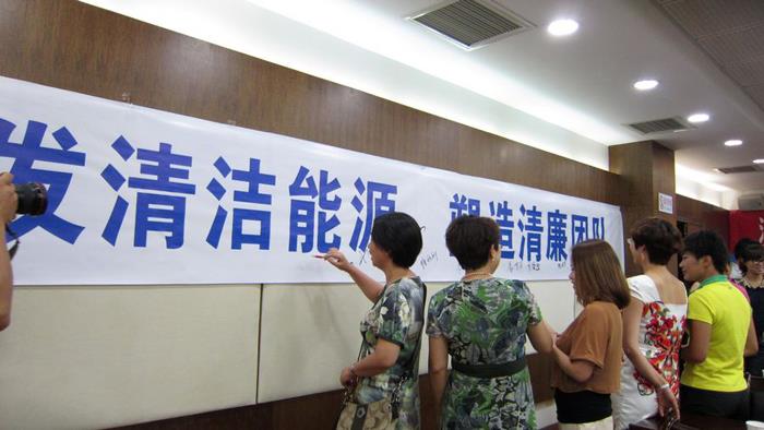 | 参会家属在“开发清洁能源,塑造清廉团队”横幅上签名。(陈涛 摄) |