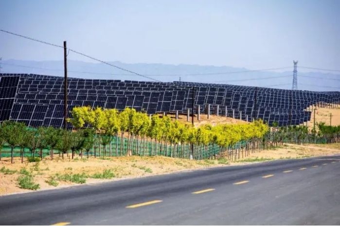 ▲库布其基地项目场区道路两边种植了防护林 摄影:张博文