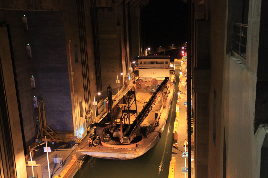 ▲ 夜间,货船在向家坝升船机承船厢中稳步上升。摄影:刘佳洋