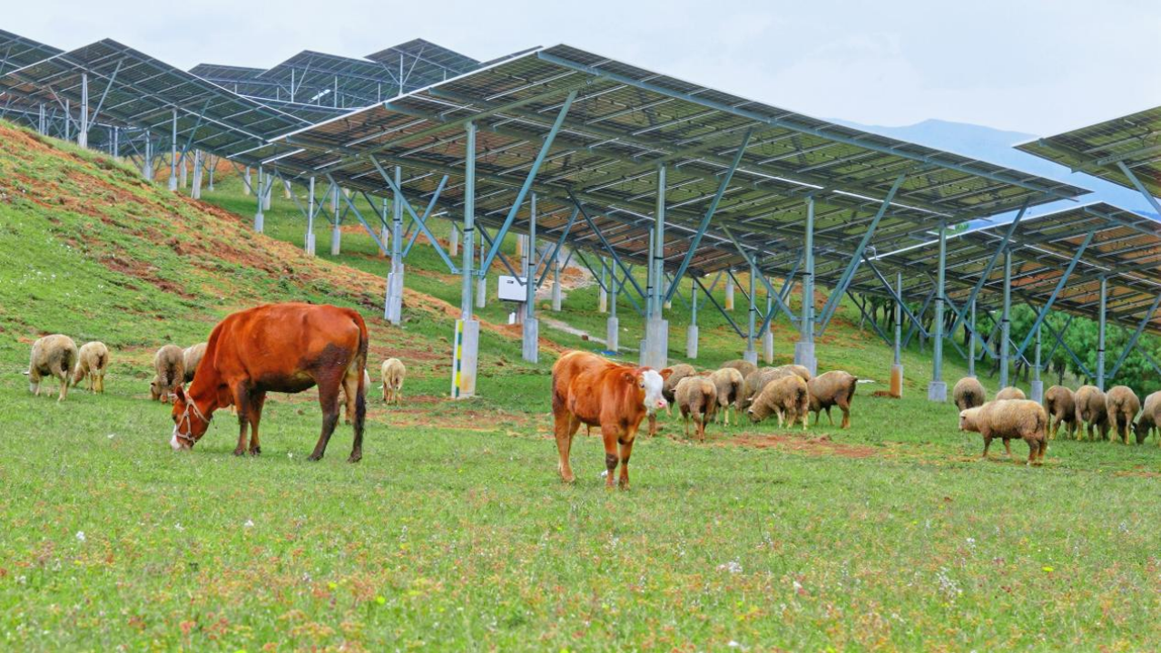 在金下基地首批投产的光伏项目中,由三峡集团云南能源投资有限公司(以下简称“三峡云南能投”)建设的项目有23个,其中10个项目采用了“牧光互补”的开发模式。项目建设过程中,通过增加光伏支架高度,打造了板上用光发电、板下放牧和生态修复的绿色发展模式,实现了经济效益和生态效益双丰收。昔日的荒山变“宝山”,“光伏+”新能源项目开发在云南山区走出了一条可持续的绿色乡村振兴之路。