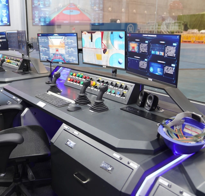 百米开外的远程操作舱内,王蓉正通过3块电子屏幕监控桥机作业,这位有着24年高空操作经验的桥机司机,头一次离开高空驾驶室,来到地面的智能舱进行远程操作。
